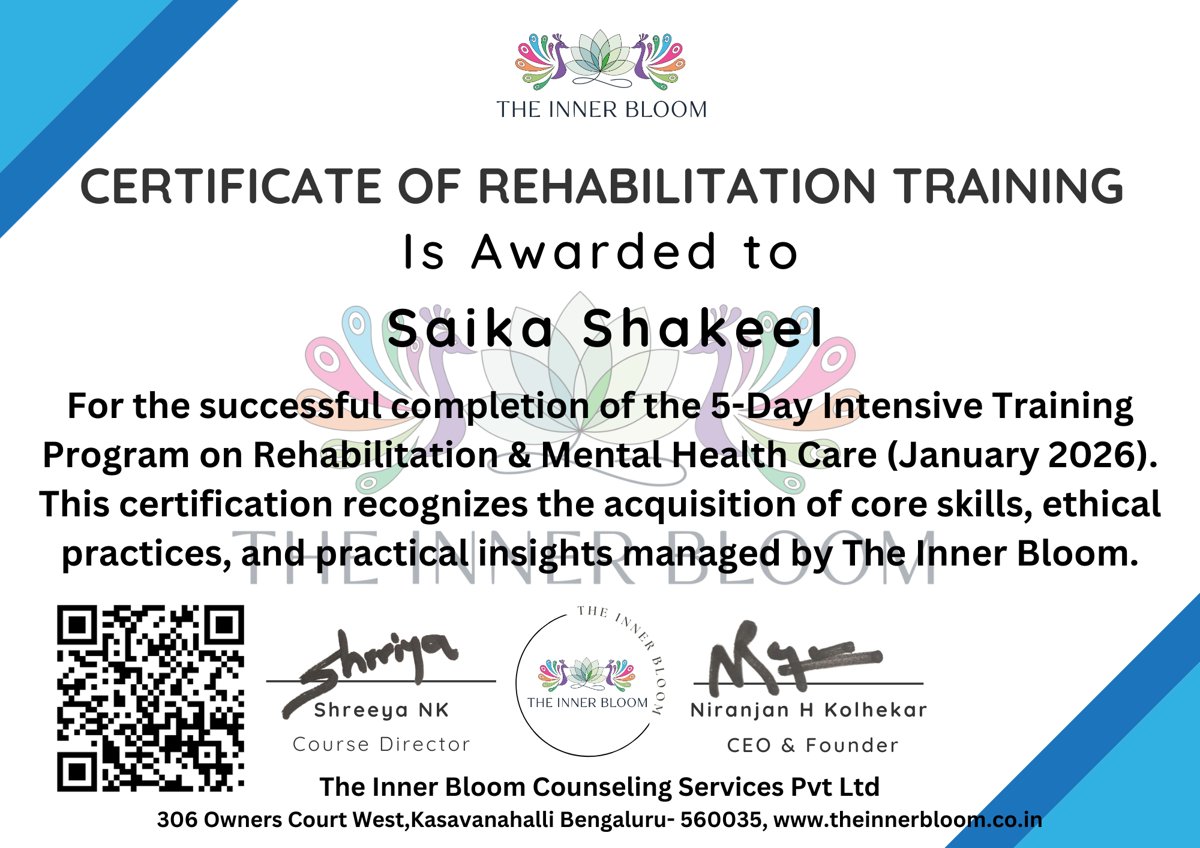 The Inner Bloom Counselling Services certifies that Saika shakeel has successfully completed 5-Day Intensive Training Program on Rehabilitation & Mental Health Care.