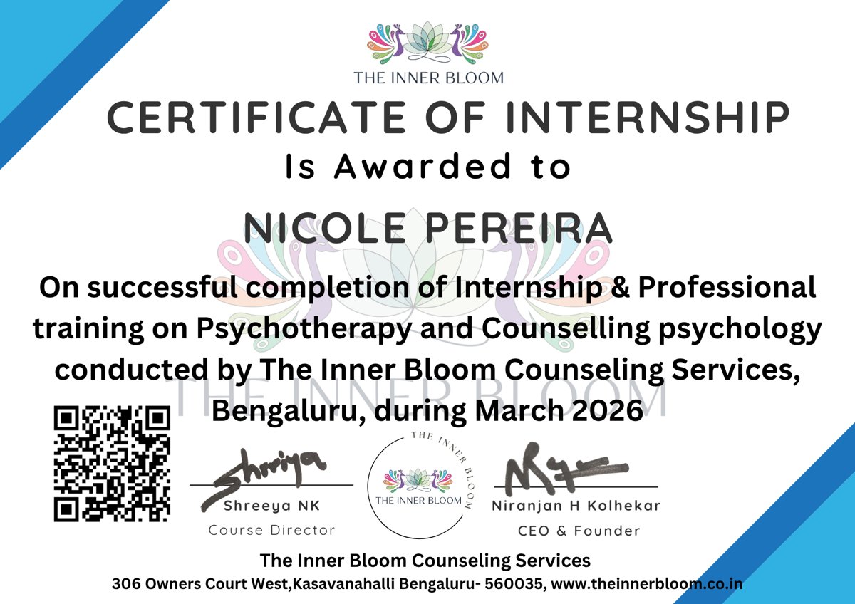 Nicole Pereira has successfully completed the Psychology (Internship / Workshop) Program at The Inner Bloom Counselling Services, issued on March 28, 2026.