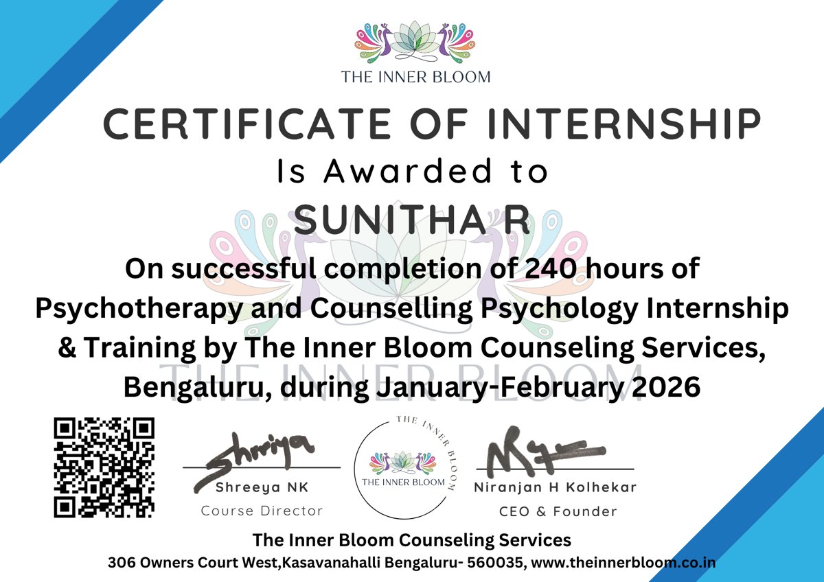 The Inner Bloom Counselling Services certifies that the student has successfully completed 240 hours of Psychotherapy and Counselling Psychology Internship & Training conducted by The Inner Bloom Counseling Services, Bengaluru, during January-February 2026.