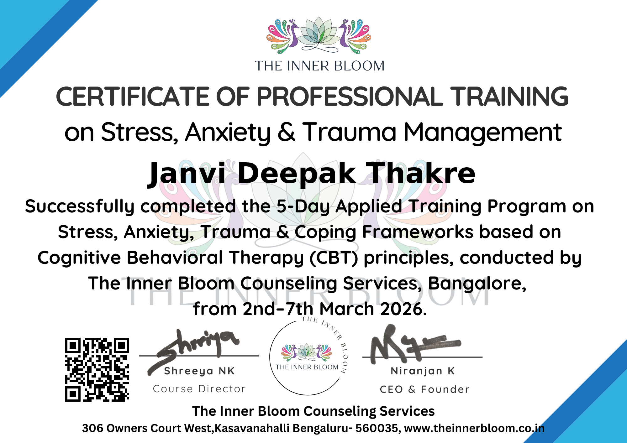 The Inner Bloom Counselling Services certifies that the student has successfully completed 5-Day Professional Training Program on Stress, Anxiety, Trauma & Emotional Wellbeing using Cognitive Behavioral Therapy (CBT)–based techniques, organized by The Inner Bloom Counseling Services.