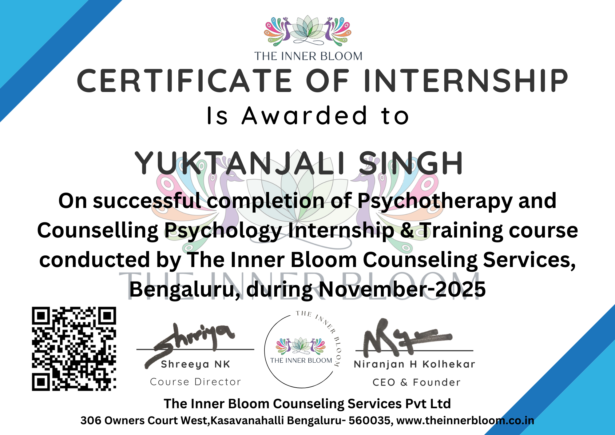 The Inner Bloom Counselling Services certifies that the student has successfully completed the internship.